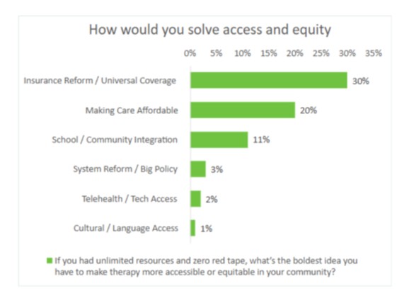 We asked more than 1,300 therapists how they would solve access and equity in mental healthcare for our Future of Therapy report. The solutions ranged from big policy changes to specific community programs. 30% recommend insurance reform or universal coverage, 20% would make care more affordable, 11% would integrate mental health care into schools and communities, 3% would create big policies or system reforms, 2% would improve telehealth and tech access, and 1% would improve cultural and language access.