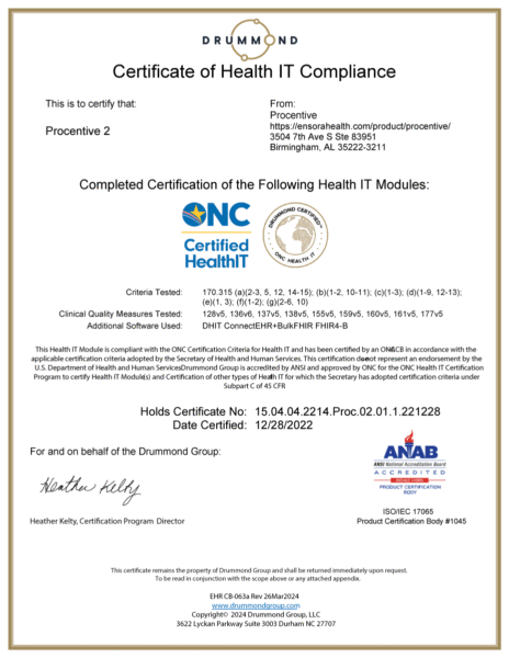 This Health IT Module is compliant with the ONC Certification Criteria for Health IT and has been certified by an ONC-ACB in accordance with the applicable certification criteria adopted by the Secretary of Health and Human Services. This certification does not represent an endorsement by the U.S. Department of Health and Human Services.