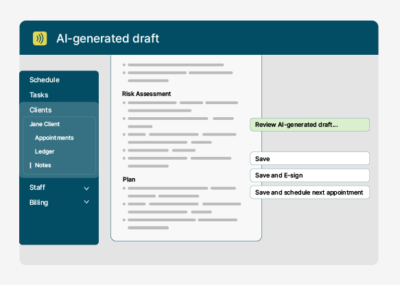 AI Session Assistant is built directly into TheraNest. It generates a SOAP note draft which you can then pull into your note templates, ready for review and signing. This reduces workflow steps and lowers the risk of moving sensitive data between systems.