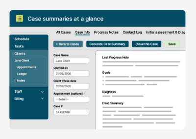 An in‑office AI scribe for in‑person sessions is planned for later this year. AI Case Summaries works for clients regardless of session type because it uses signed documentation already in the chart.